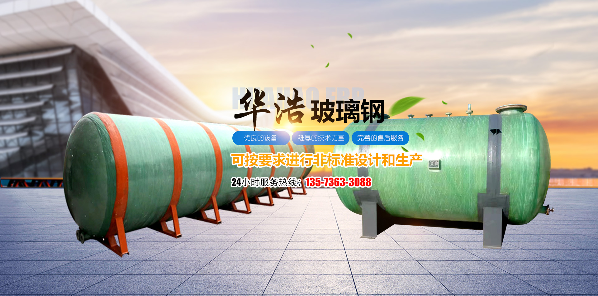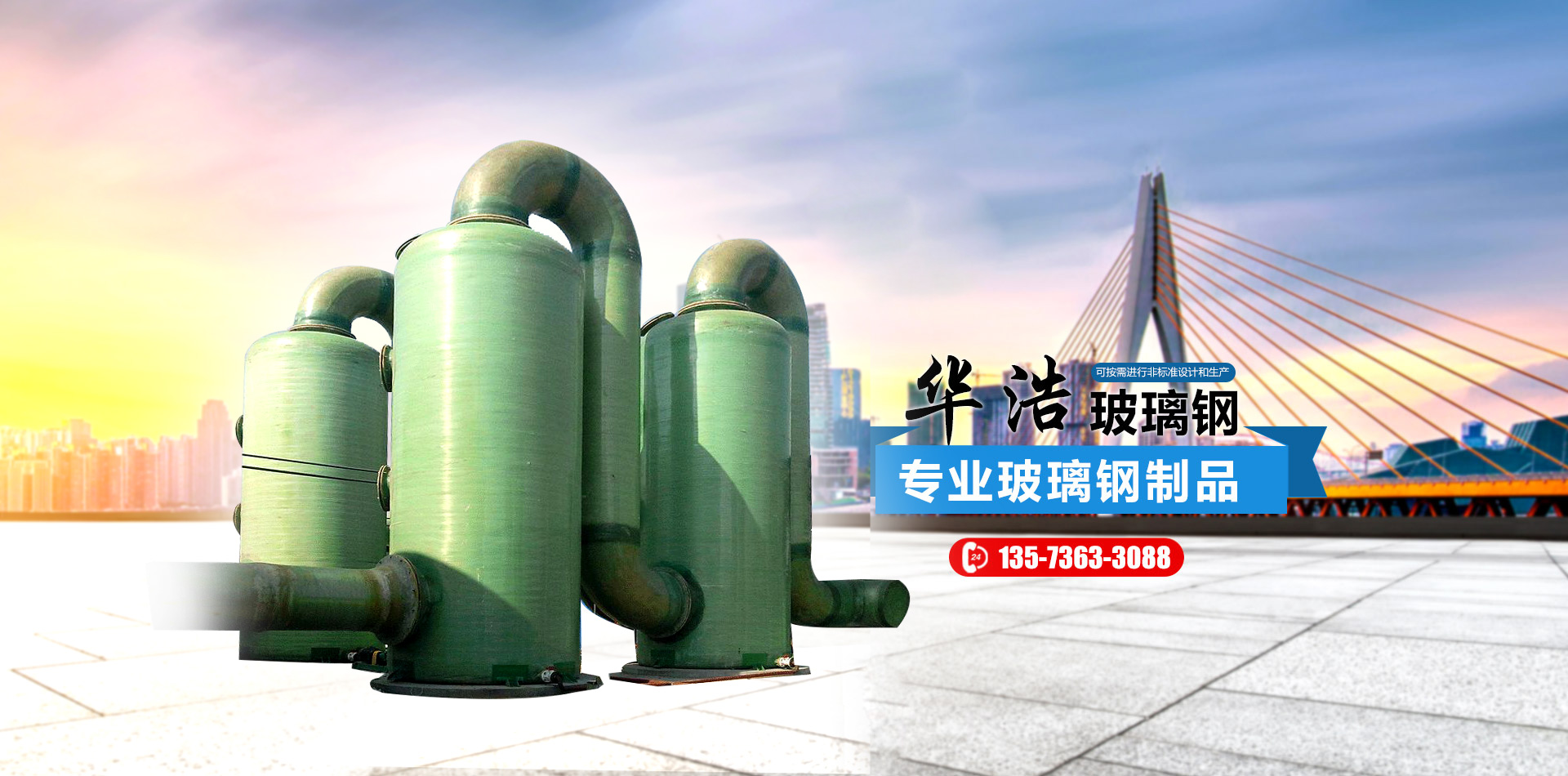 山東華浩玻璃鋼有限公司,位于世界風(fēng)箏都濰坊市南三十公里處,是生產(chǎn)各種玻璃鋼制品的專業(yè)公司。   華浩玻璃鋼生產(chǎn)各種立式、臥式玻璃鋼罐、玻璃鋼儲罐、玻璃鋼運輸罐、標準運輸罐、玻璃鋼鹽酸罐、化學(xué)反應(yīng)罐、真空壓力罐、設(shè)備罐、復(fù)合罐、玻璃鋼儲槽、大型玻璃鋼容器;玻璃鋼化糞池;各種型號的橫流式、逆流式(圓形、方形)玻璃鋼冷卻塔;機械纏繞玻璃鋼管道、管件、壓力管道,有機、無機通風(fēng)管道、空調(diào)管道;漂液洗鼓、耐腐耐高溫反應(yīng)釜、印染布車、組合式玻璃鋼水箱、玻璃鋼風(fēng)機、玻璃鋼不定型工藝品等二百多個品種。